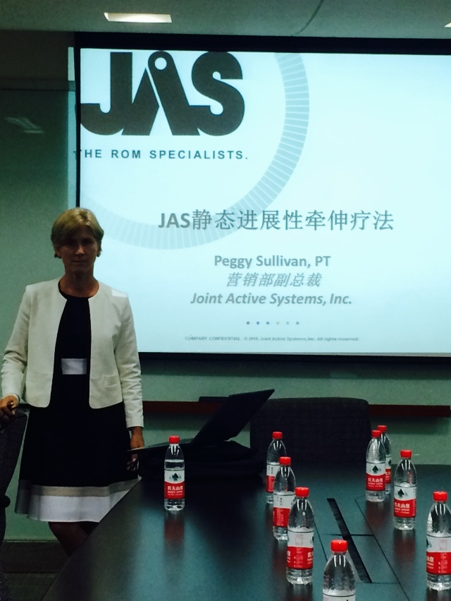 沙龍活動特邀美國馬薩諸塞州綜合醫院授權物理治療師,JAS公司高級副總裁Peggy女士來我院進行牽伸技術國際發展動態,醫技牽伸技術在康復中應用的學術交流活動。 Peggy女士在認真講解,傳授理論中。